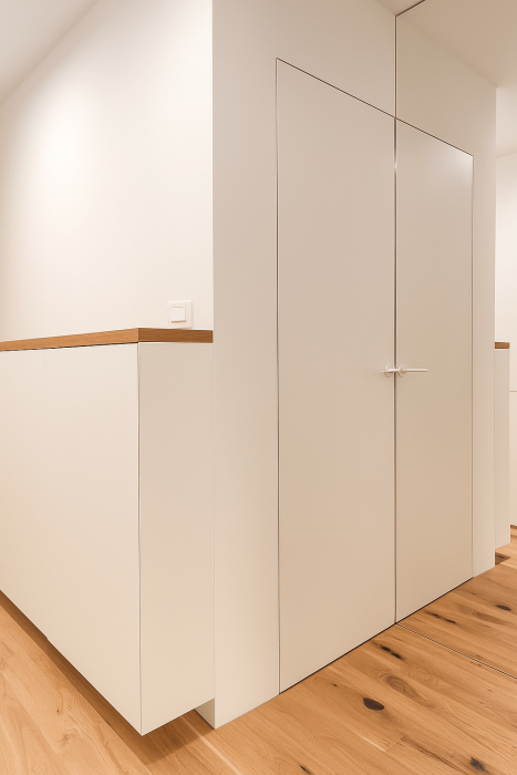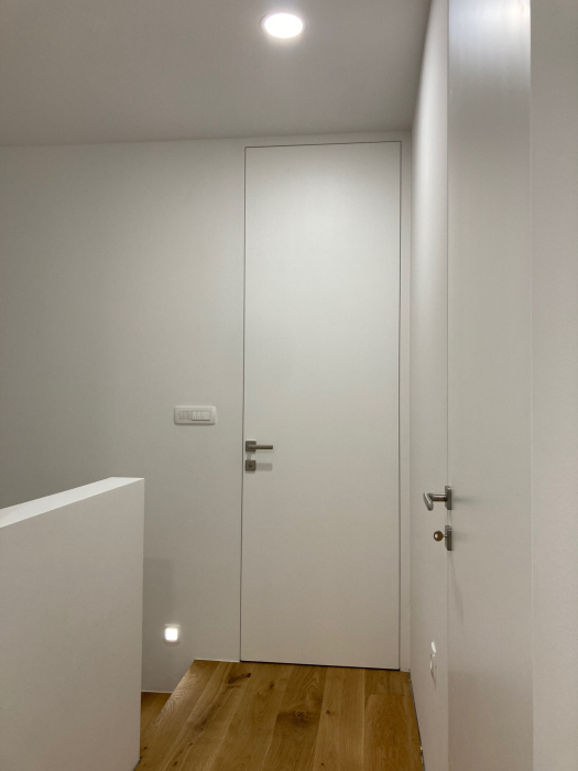 Nevidni podboji v prostoru ustvarjajo moderen dizajn, kjer se notranja vrata popolnoma poravnajo z linijo zidu. Stik vrat in zidu predstavlja le ozka fuga, pri čemer je viden zgolj rob aluminijastega podboja.