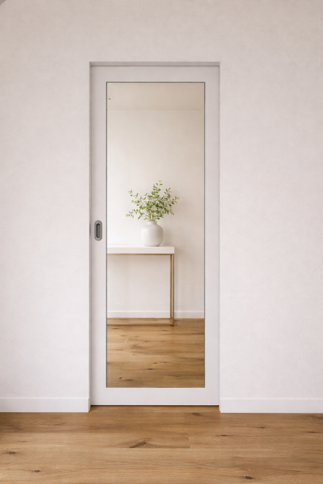 Moderna notranja vrata s skritimi podboji omogočajo poravnavo z zidom v hodniku, pri čemer se lahko vrata odpirajo bodisi v prostor bodisi v hodnik. Aluminijasti okvir pritrdimo v zidarsko odprtino in ga malarsko obdelamo po vgradnji vrat.